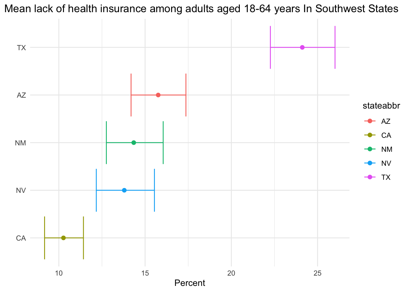 labs(title = "Mean lack of health insurance among adults aged 18-64 years In Southwest States",