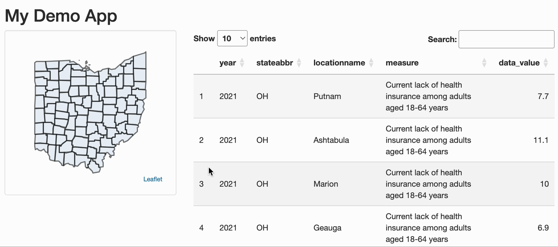 library(leaflet)library(shiny)library(tigris)library(CDCPLACES)library(dplyr)library(htmltools)ohio <-get_places(state ="OH", measure ="ACCESS2", geometry =TRUE) |>filter(datavaluetypeid =="AgeAdjPrv") |>select(year, stateabbr, locationname, measure, data_value, geometry) |> sf::st_transform(crs =4326)ui <-fluidPage( tags$head( tags$style(HTML(".leaflet-container { background: none; } .well { background: none;}")) ),# Application titletitlePanel("My Demo App"),# Sidebar with a slider input for number of binssidebarLayout(sidebarPanel(leafletOutput("mapfilter", height =250) ),# Show a plot of the generated distributionmainPanel( DT::DTOutput("table") ) ))# Define server logic required to draw a histogramserver <-function(input, output, session) { rv <-reactiveValues(selected_counties =NULL,filtered_data = ohio) # Initialize reactive value for selected countiesobserveEvent(input$mapfilter_shape_click, { # this is the logic behind the "click" of the map. click <- input$mapfilter_shape_click########## map behavior ################# If a county is clickedif (click$id %in% rv$selected_counties) {# If selected, remove it rv$selected_counties <- rv$selected_counties[rv$selected_counties != click$id] } elseif(click$id =="selected"){ # when a county is clicked again it is removed rv$selected_counties <- rv$selected_counties[rv$selected_counties !=tail(rv$selected_counties, n =1)] }else {# If not selected, add it rv$selected_counties <-c(rv$selected_counties, click$id) }leafletProxy("mapfilter", session) |>addPolygons(data = ohio,layerId =~locationname,label =~locationname,fillColor ="steelblue", # Change fill color based on selectioncol ="black",weight =2,fillOpacity =ifelse(ohio$locationname %in% rv$selected_counties, 1, 0.1),highlight =highlightOptions(fillOpacity =1,bringToFront =TRUE) ) }) output$mapfilter <-renderLeaflet({ # rendering the filter mapleaflet(ohio,options =leafletOptions( # initializing the mapzoomControl =FALSE,dragging =FALSE,minZoom =6,maxZoom =6 )) %>%addPolygons(layerId =~locationname,label =~locationname,# fillColor = "black",col ="black",fillColor ="steelblue",weight =2,fillOpacity = .1,highlight =highlightOptions(fillOpacity =1,bringToFront =TRUE )) }) output$table <- DT::renderDT({ rv$filtered_data |> sf::st_set_geometry(NULL) |> DT::datatable() })observe({ # Update table filtering based on selected countiesif (!is.null(rv$selected_counties) &length(rv$selected_counties) >0) { # Check if any counties are selected rv$filtered_data <- ohio |>filter(locationname %in% rv$selected_counties) } else { rv$filtered_data <- ohio } })}# Run the applicationshinyApp(ui = ui, server = server)