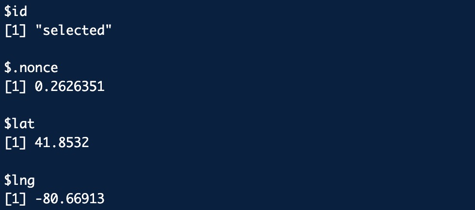 The code chunk below runs when a polygon on our map is clicked. That is the logic of the observeEvent function and its argument input$mapfilter_shape_click. Because our actions all relate to this event, we can wrap all of our code in it. The other step here is to store the input in an object called click.